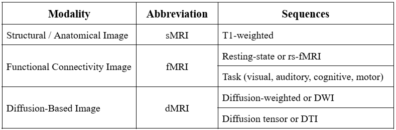 In this stage, images are processed for motion correction, denoising, smoothing, modulation, and alignment between modalities . Each MRI sequence (e.g. T1-weighted, resting) can be classified by a certain MRI modality as shown in the table below.