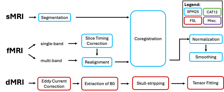 Structural MRI (sMRI) are 3D objects that are used to identify tissue types present in the image. Functional MRI (fMRI) are 4D objects that focus more on the BOLD (blood oxygenation level dependent) signal to map brain activity. Diffusion MRI (dMRI) are 4D objects that use the directionality of water diffusion to map out white matter tracts. Different modalities require different steps of preprocessing. Below summarizes these steps for each MRI modality.