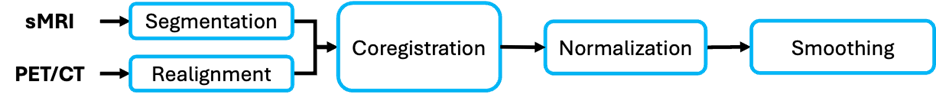 PET images are 3D objects that store information about metabolic activity of different regions of the brain. PET images can be treated similar to functional images except that the preprocessing does not involve slice timing correction. Below are the steps in preprocessing PET images