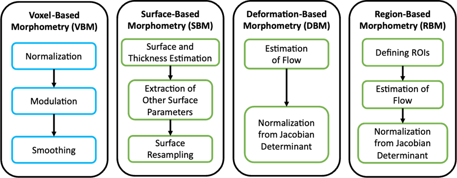 In this analysis, a nonlinear registration is used to normalize each structural image, correcting the global orientation and size of the brain. The flow is obtained as the Jacobian determinant, which is used to minimize the regional differences due to local deformations. Applications include: a) assessing structural changes in TBI, aiding in treatment planning, and b) tracking progression of neurodevelopment or cognitive decline. The outputs are measurements of percentage change in volume per voxel