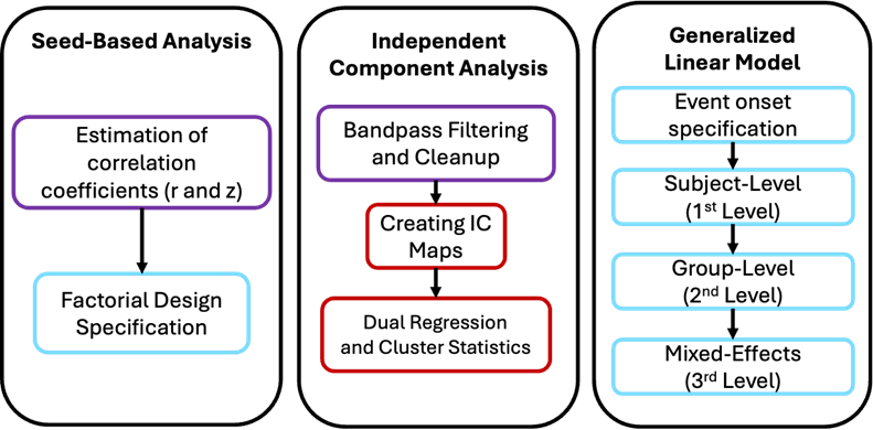 Analyzing functional images allows us to see how each brain region is interconnected forming a network, and learn which regions activate when performing a certain task. Below are the available analyses for functional images