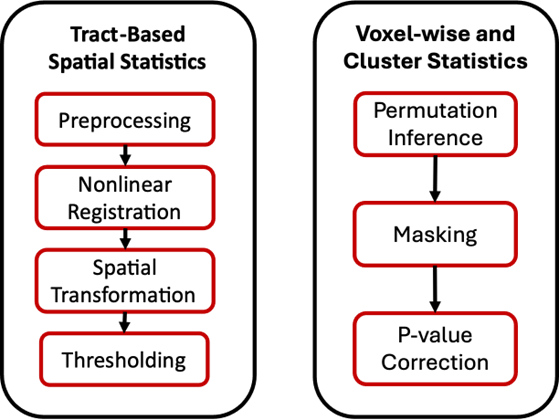 In this analysis, a nonparametric permutation inference is applied for each voxel. Clusters are defined via threshold-free cluster enhancement (TFCE) which uses nonbinary thresholding. Applications include: a) pinpointing regions of altered anisotropy to detect lesion and changes in pathways, and b) identifying patterns of atrophy for tracking progressions of different neurological disorders. The outputs are percentage changes of the fractional anisotropy, mean diffusivity coefficient, mode of anisotropy, eigenvectors and eigenvalues
