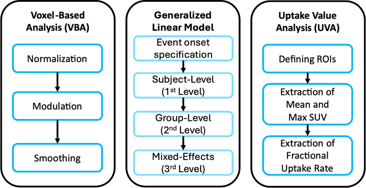 Since PET images are 3D similar to structural images, we can use voxel-based analysis to investigate local concentration of radiotracers between groups. Each voxel is analyzed individually after spatial normalization to a standard template space. The outputs are measurement of changes in the uptake value